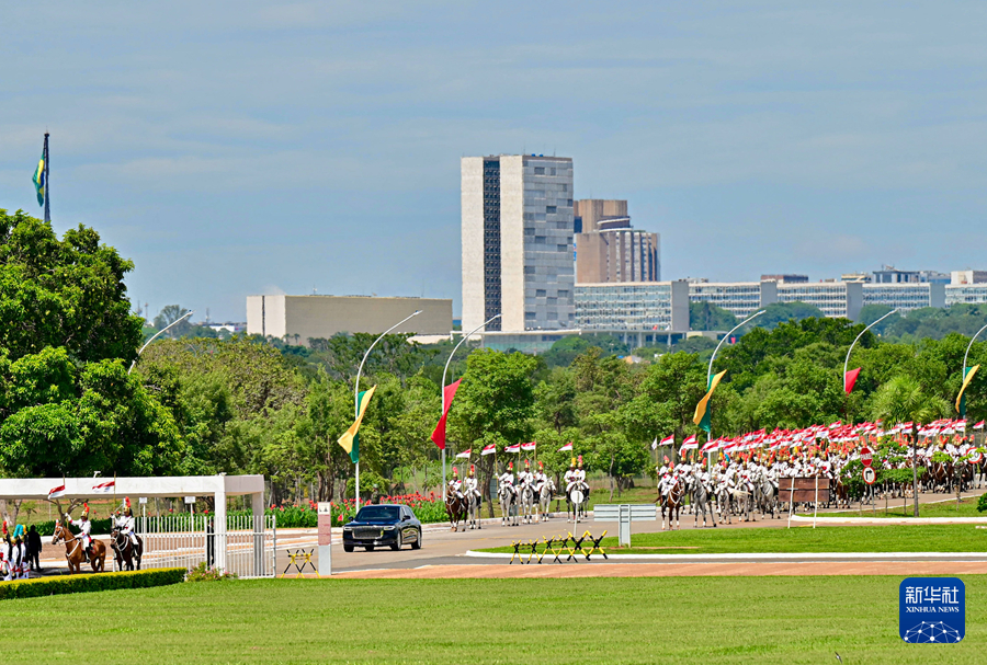 初夏時節(jié)的巴西利亞,天朗氣清。黎明宮內(nèi),綠草如茵,450名威武禮兵整齊列隊。在120名龍騎兵護衛(wèi)下,習近平乘車抵達黎明宮前廣場。