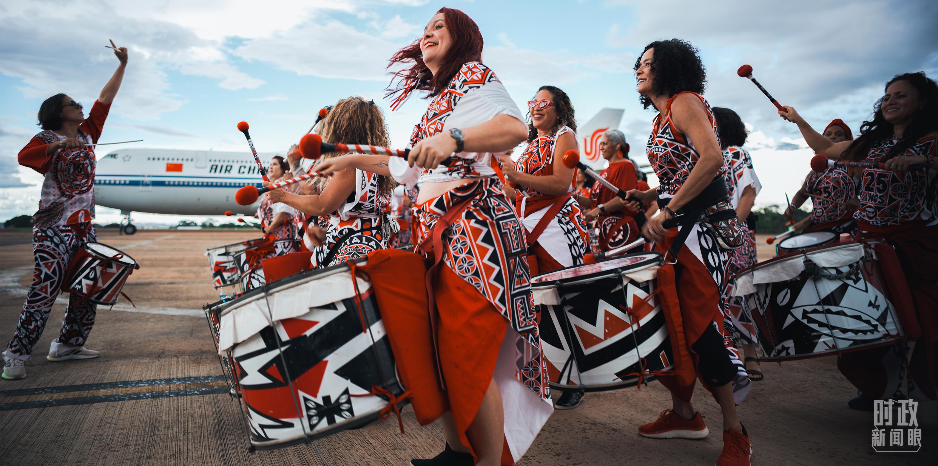 習(xí)主席乘專機(jī)抵達(dá)巴西利亞,藝術(shù)家演奏特色鼓樂。(總臺央視記者彭漢明拍攝)