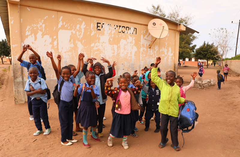 △ 當(dāng)?shù)貢r間2023年7月25日,莫桑比克馬普托省皮科科村學(xué)校的孩子們站在裝有中國援助的衛(wèi)星電視接收天線的房屋前。