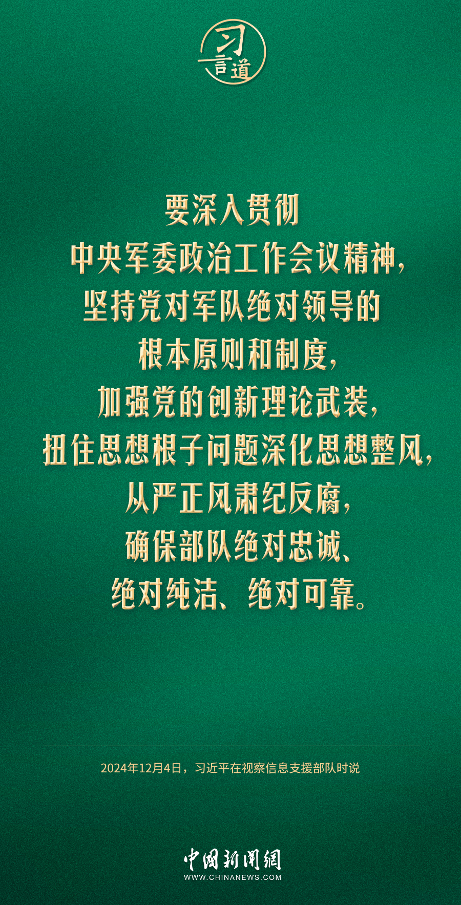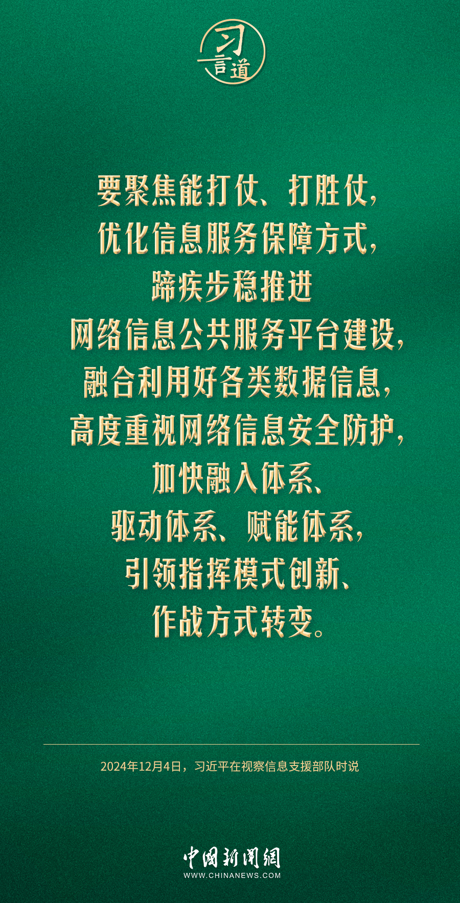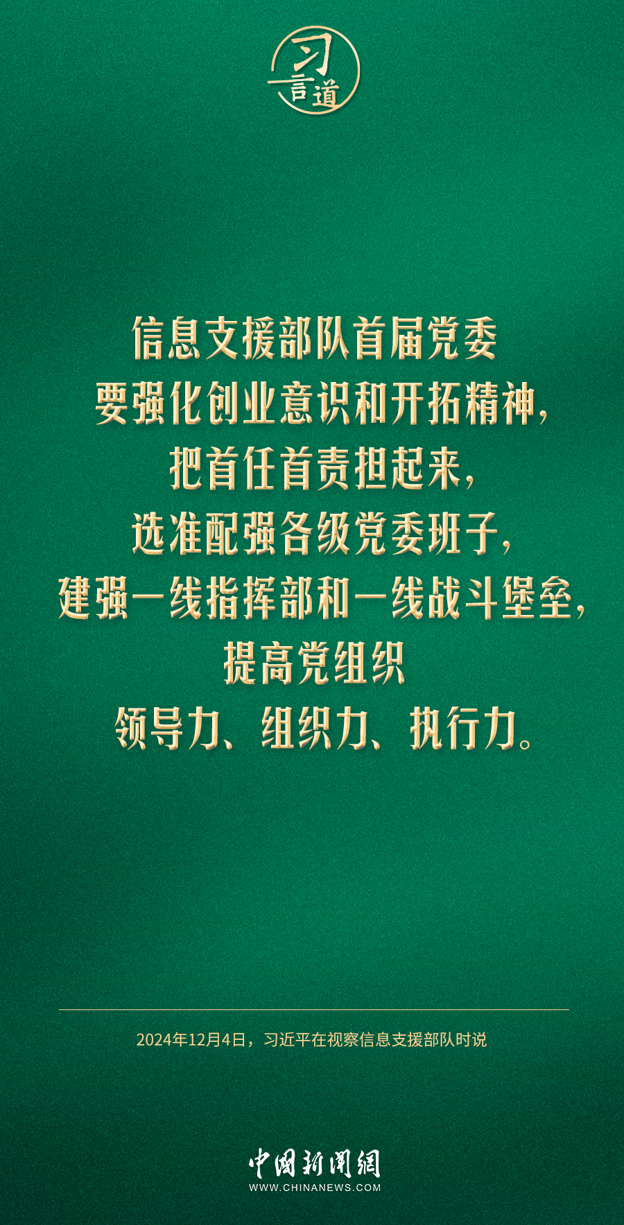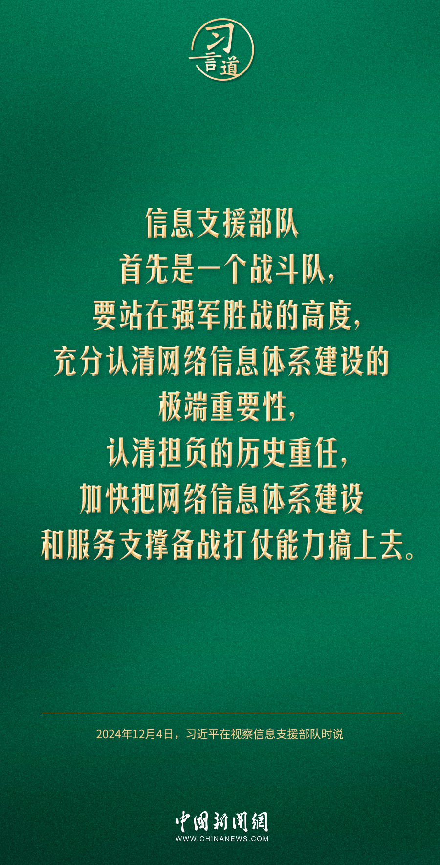中共中央總書記、國家主席、中央軍委主席習(xí)近平4日視察信息支援部隊(duì),代表黨中央和中央軍委,對信息支援部隊(duì)第一次黨代表大會(huì)的召開表示熱烈祝賀,向信息支援部隊(duì)全體官兵致以誠摯問候。習(xí)近平指出——
