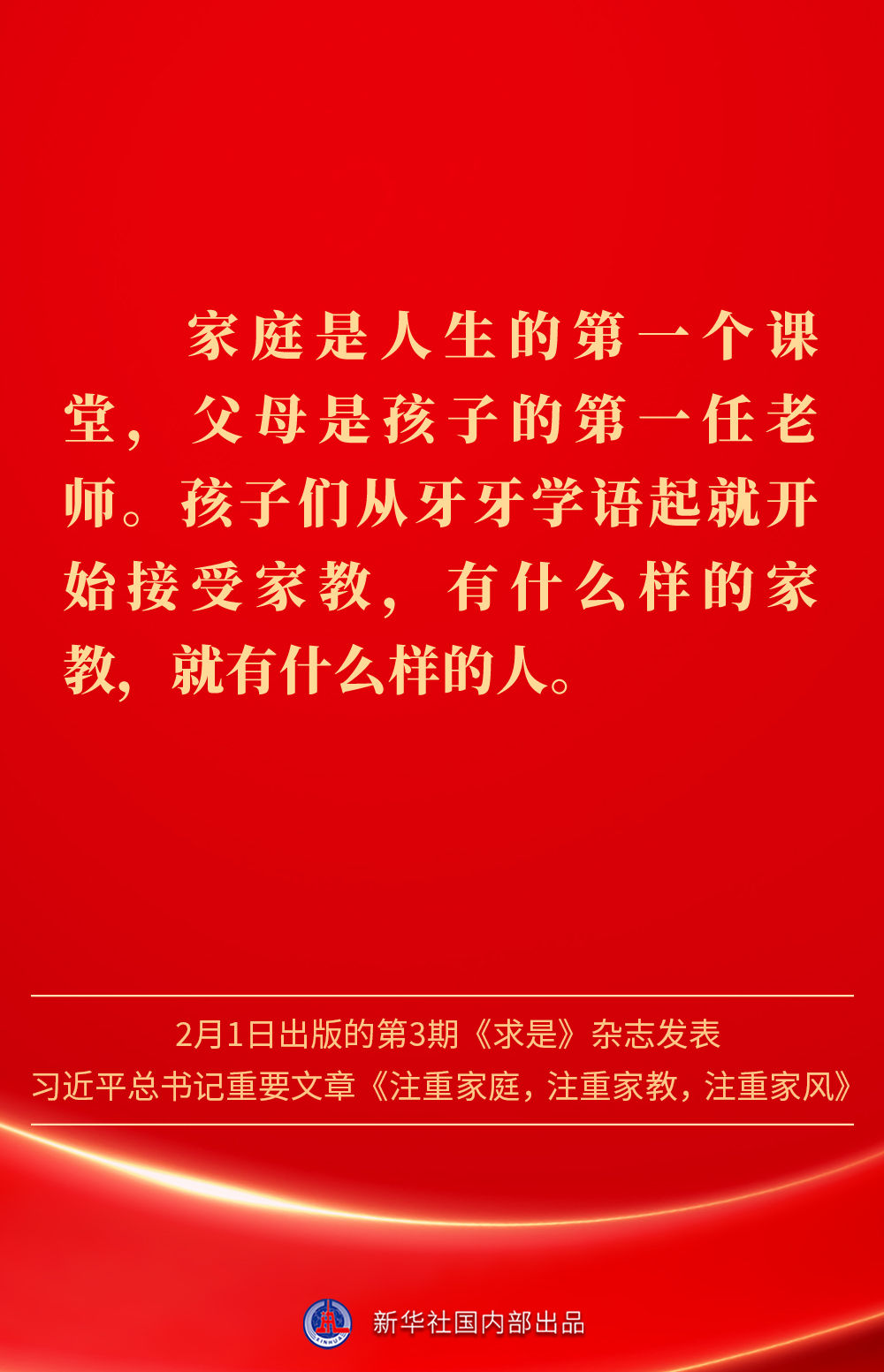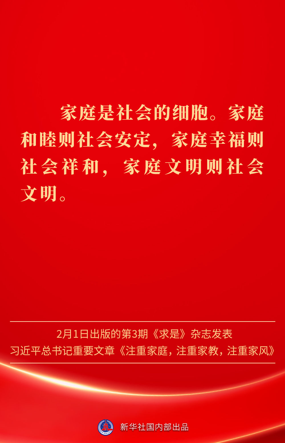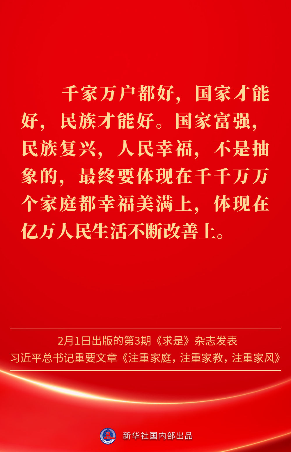 萬(wàn)家團(tuán)圓共慶新春佳節(jié)之際,2月1日出版的第3期《求是》雜志發(fā)表習(xí)近平總書(shū)記重要文章《注重家庭,注重家教,注重家風(fēng)》。為什么要注重家庭、家教、家風(fēng)?如何做好家庭文明建設(shè)?習(xí)近平總書(shū)記這樣闡述——