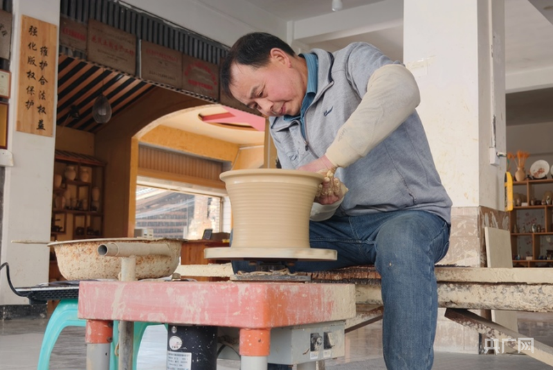 母先才在自己的陶藝館內制作盬子(央廣網(wǎng)記者 欒小琳 攝)