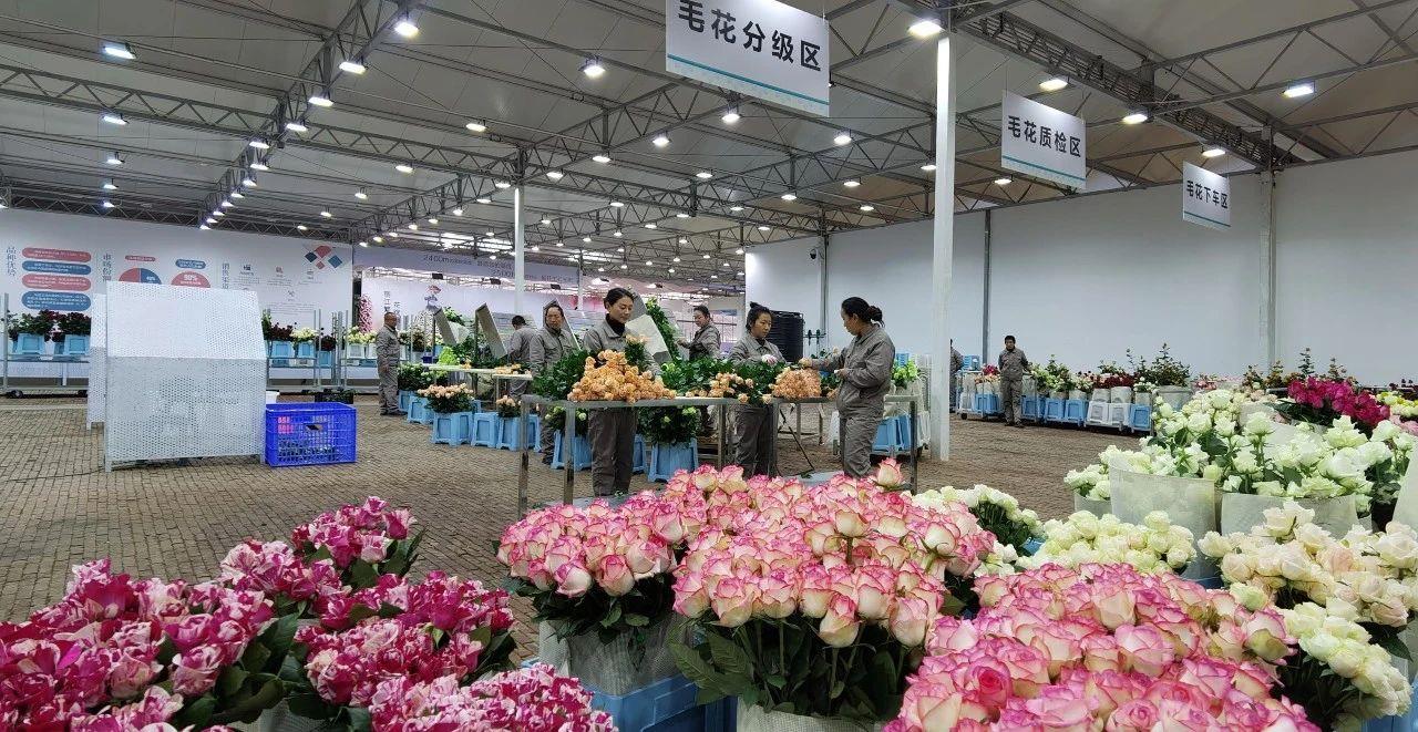 △云南麗江現(xiàn)代花卉產業(yè)園內,工人正在分類整理鮮花。