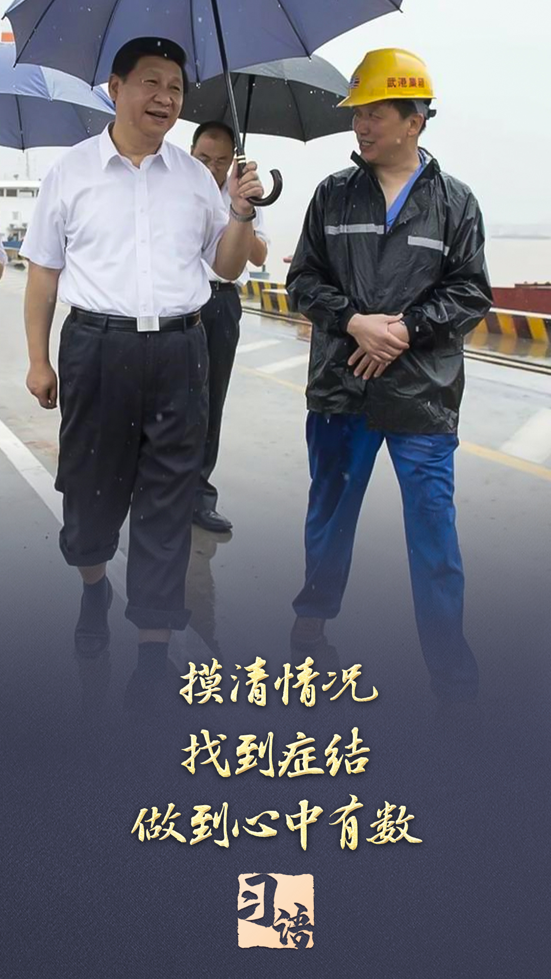 2013年7月,習(xí)近平總書記冒雨來到湖北武漢新港陽邏集裝箱港區(qū)考察,他卷起褲腿,打著雨傘,蹚著積水邊走邊看邊問。兩天后,在武漢主持召開部分省市負(fù)責(zé)人座談會時,習(xí)近平總書記強調(diào):“研究、思考、確定全面深化改革的思路和重大舉措,刻舟求劍不行,閉門造車不行,異想天開更不行,必須進行全面深入的調(diào)查研究。”