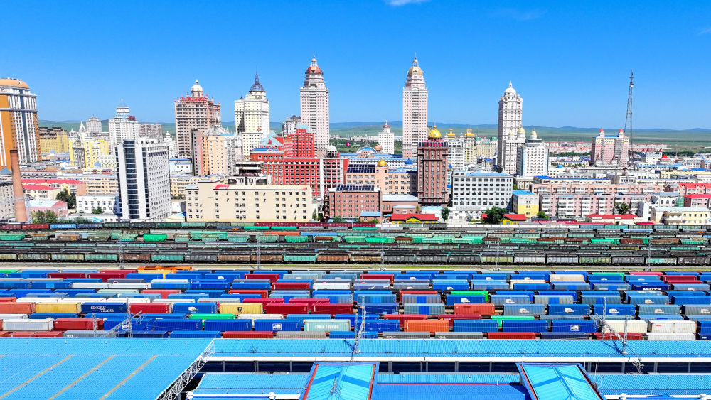 2024年8月20日,中歐班列在內(nèi)蒙古滿洲里口岸準(zhǔn)備出境(無人機(jī)照片)。滿洲里口岸位于中俄蒙三國交界處,是中國最大的陸路口岸,也是連接俄羅斯、蒙古國的重要樞紐。2024年,滿洲里口岸中歐班列通行量突破4000列,為推進(jìn)高質(zhì)量共建“一帶一路”注入新動能。