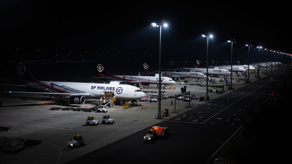 2024年5月25日凌晨,工人在湖北鄂州花湖國際機(jī)場停機(jī)坪裝卸貨物。鄂州花湖國際機(jī)場于2022年7月建成投運(yùn),是亞洲首個專業(yè)貨運(yùn)樞紐機(jī)場。截至2025年1月26日,鄂州花湖國際機(jī)場已開通37條國際貨運(yùn)航線和66條國內(nèi)貨運(yùn)航線。