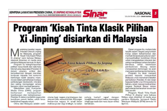 4月15日,馬來西亞中文、英文、馬來文主流媒體《星洲日報》《星報》《陽光日報》分別刊發(fā)節(jié)目在馬來西亞落播的消息。文章指出,《平“語”近人——習近平喜歡的典故》(馬來語版)特別選取了“萬物各得其和以生,各得其養(yǎng)以成”等典故,生動闡釋中國堅持不同文明之間平等交流、互學互鑒,愿意為人類破解時代難題、實現(xiàn)共同發(fā)展提供強大的精神指引,有助于馬來西亞民眾更好讀懂新時代中國之治的成功密碼,感知中國式現(xiàn)代化蓬勃發(fā)展的強勁脈動。
