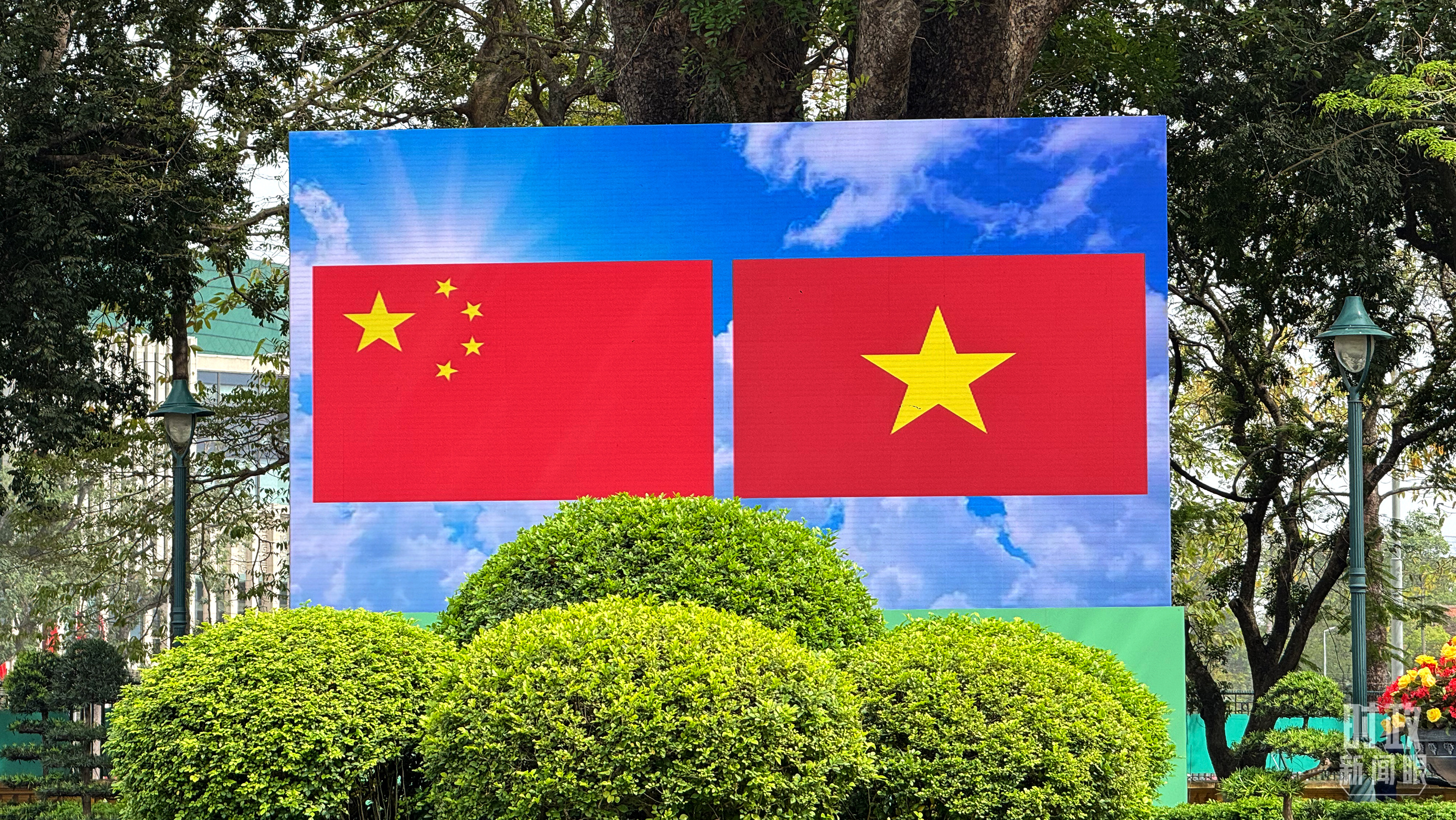 歡迎儀式現場大屏幕上展示的中越兩國國旗。(總臺央視記者蔣碩拍攝)