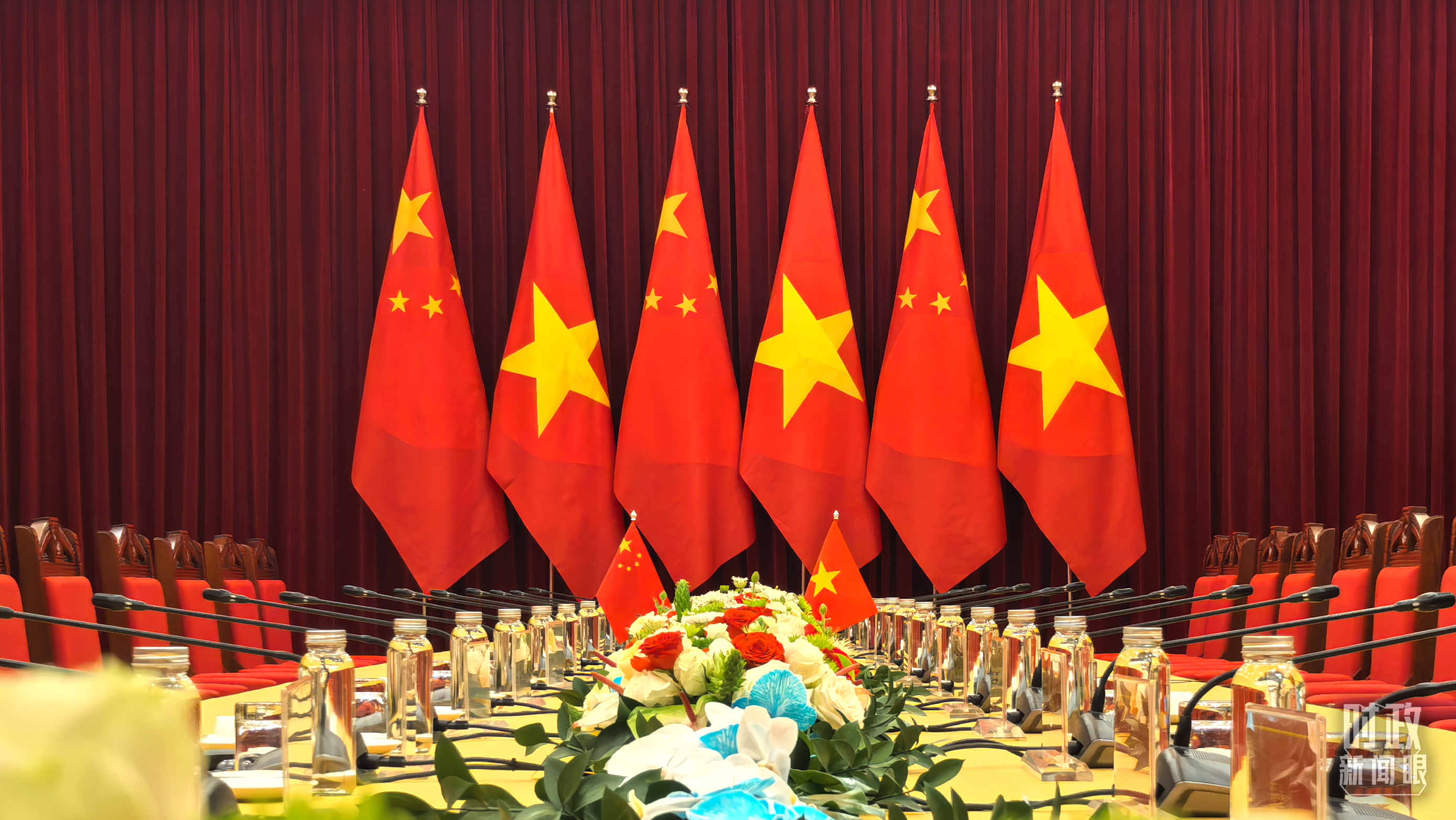 歡迎宴會現場擺放的中越兩國國旗。(總臺央視記者鄂介甫拍攝)