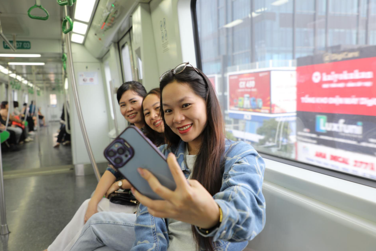 越南當(dāng)?shù)孛癖娫诤觾?nèi)吉靈-河?xùn)|線輕軌車廂里自拍。(人民日報記者 沈小曉 攝)