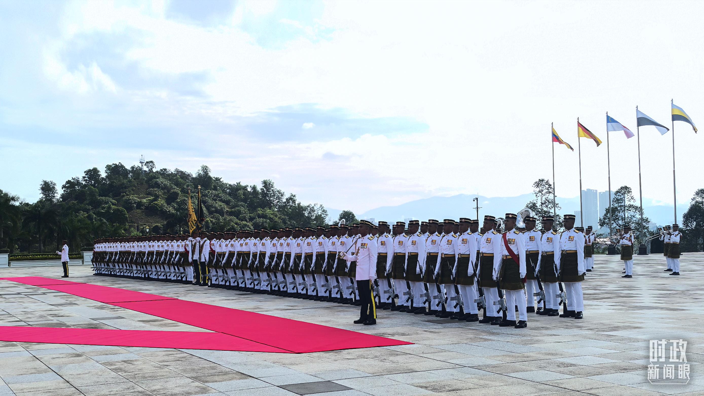 16日,馬來(lái)西亞最高元首易卜拉欣在國(guó)家王宮廣場(chǎng)為習(xí)主席舉行隆重歡迎儀式,隨后兩國(guó)元首舉行會(huì)見。安瓦爾總理全程陪同。
