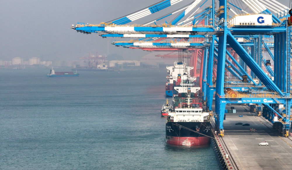 2024年12月31日,遠(yuǎn)洋貨輪在欽州港集裝箱自動(dòng)化碼頭排隊(duì)卸貨(無(wú)人機(jī)照片)。新華社記者 呂帥 攝