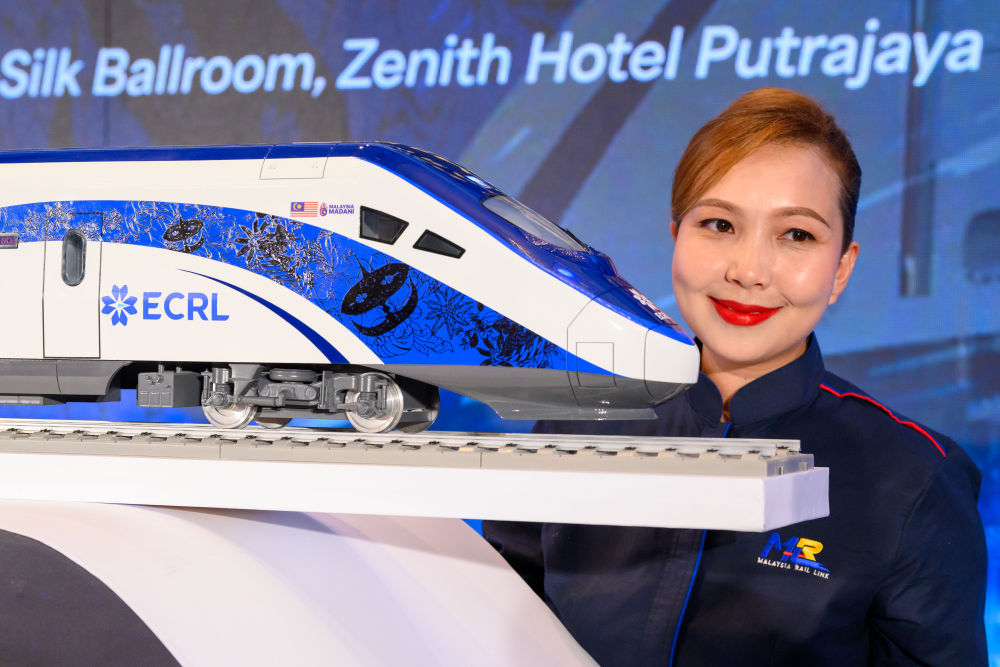 2024年12月18日,在馬來(lái)西亞普特拉賈亞,模特與新的動(dòng)車組模型合影。新華社發(fā)(張紋綜 攝)