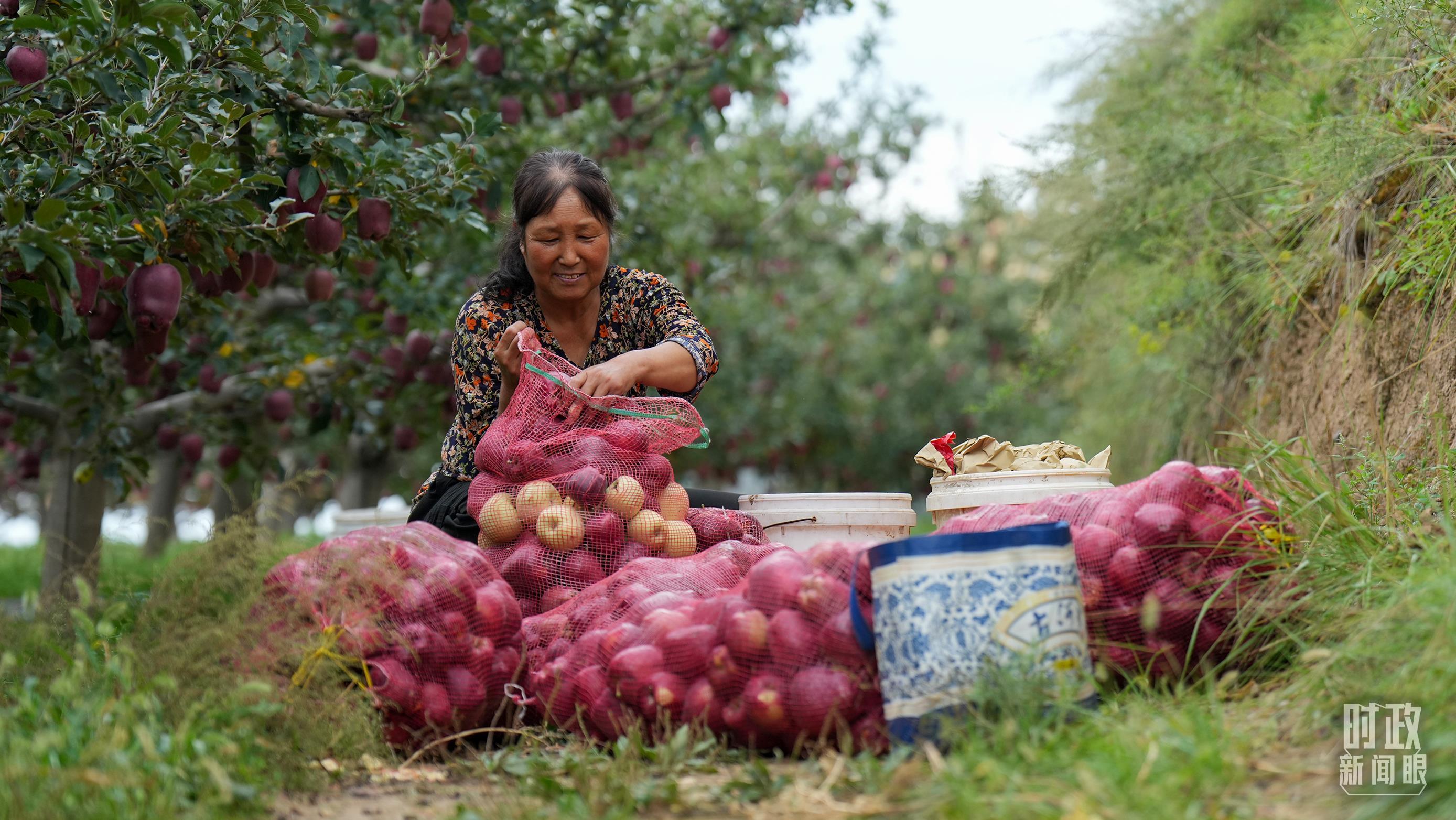 △甘肅天水市南山花牛蘋(píng)果基地帶動(dòng)當(dāng)?shù)卮迕駥?shí)現(xiàn)增收。(總臺(tái)記者李晉拍攝)