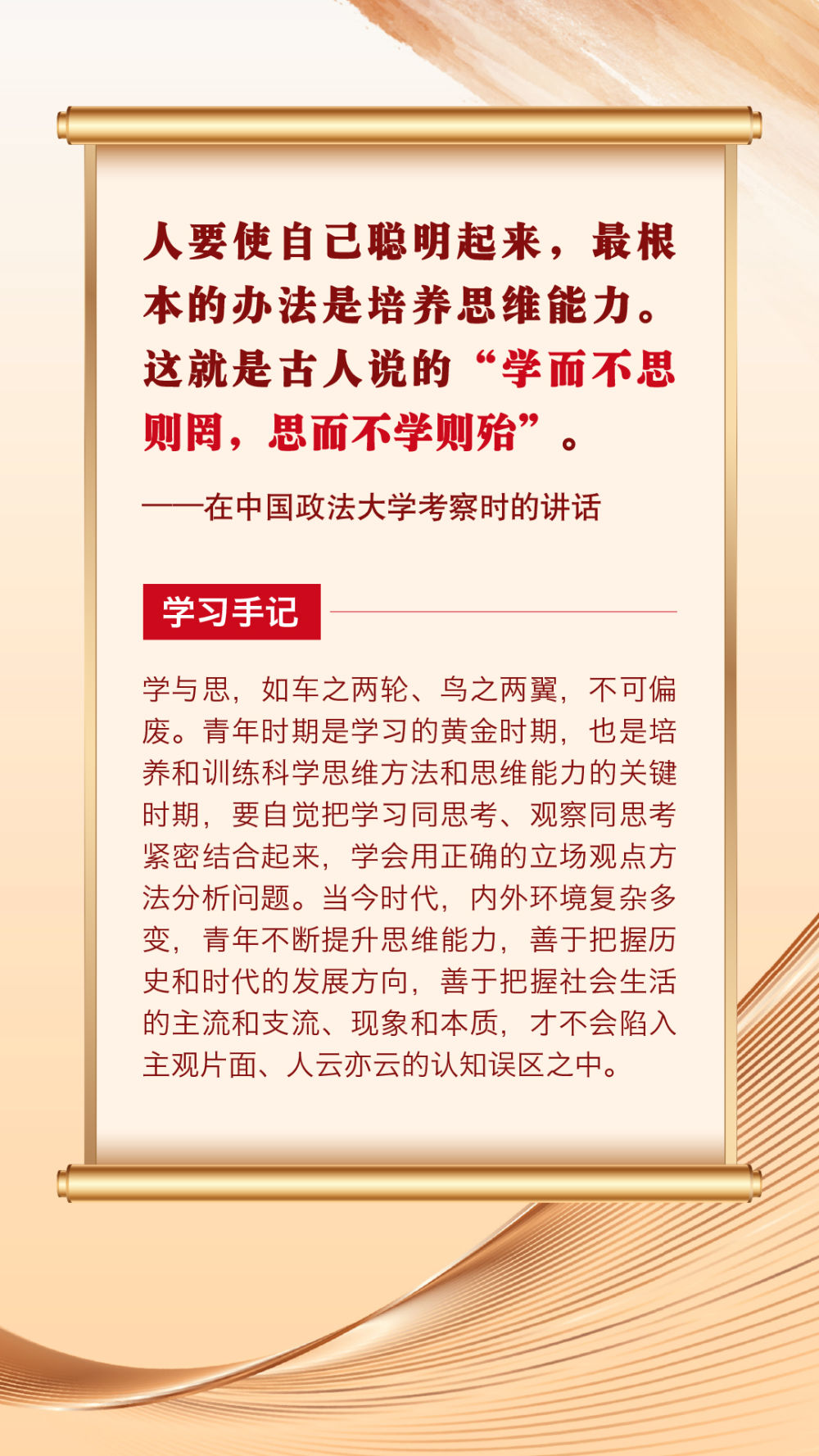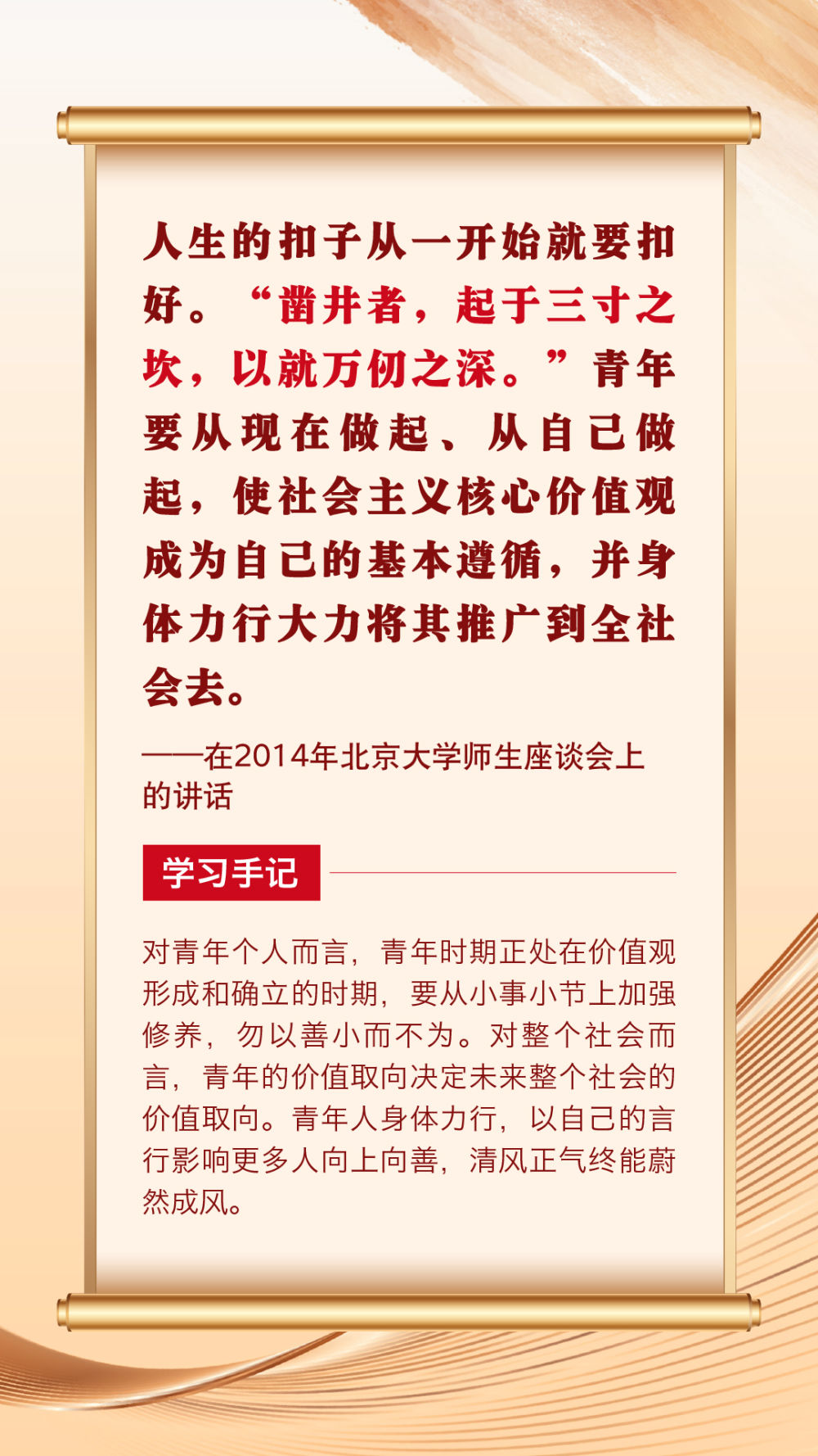 “青年者,國(guó)家之魂?!鼻嗄暌淮院畏N精神風(fēng)貌站上時(shí)代舞臺(tái),關(guān)乎祖國(guó)的明天、民族的未來。黨的十八大以來,習(xí)近平總書記圍繞青年成長(zhǎng)成才作出許多重要論述。其中,有信手拈來的精妙典故,有貫古通今的廣征博引,引領(lǐng)廣大青年不斷在中華文化的浸潤(rùn)中堅(jiān)定中國(guó)心、涵養(yǎng)民族魂,成長(zhǎng)為堪當(dāng)復(fù)興重任的時(shí)代新人。