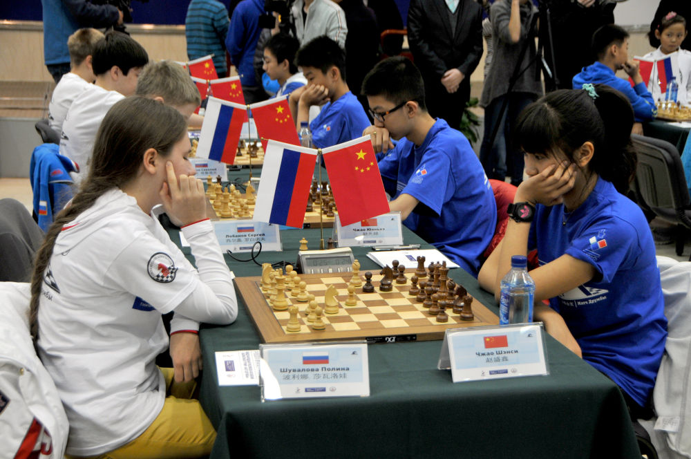 2014年11月7日,來自中國和俄羅斯的國際象棋青少年選手在“以棋會友”中俄國際象棋青少年友誼賽中對弈。
