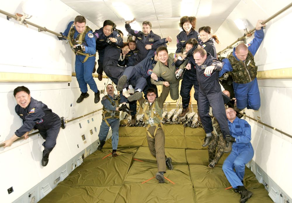 2004年12月17日,在俄羅斯首都莫斯科的加加林阿特拉斯宇航中心,10名中國游客在俄羅斯宇航員的保護(hù)下體驗太空失重訓(xùn)練。