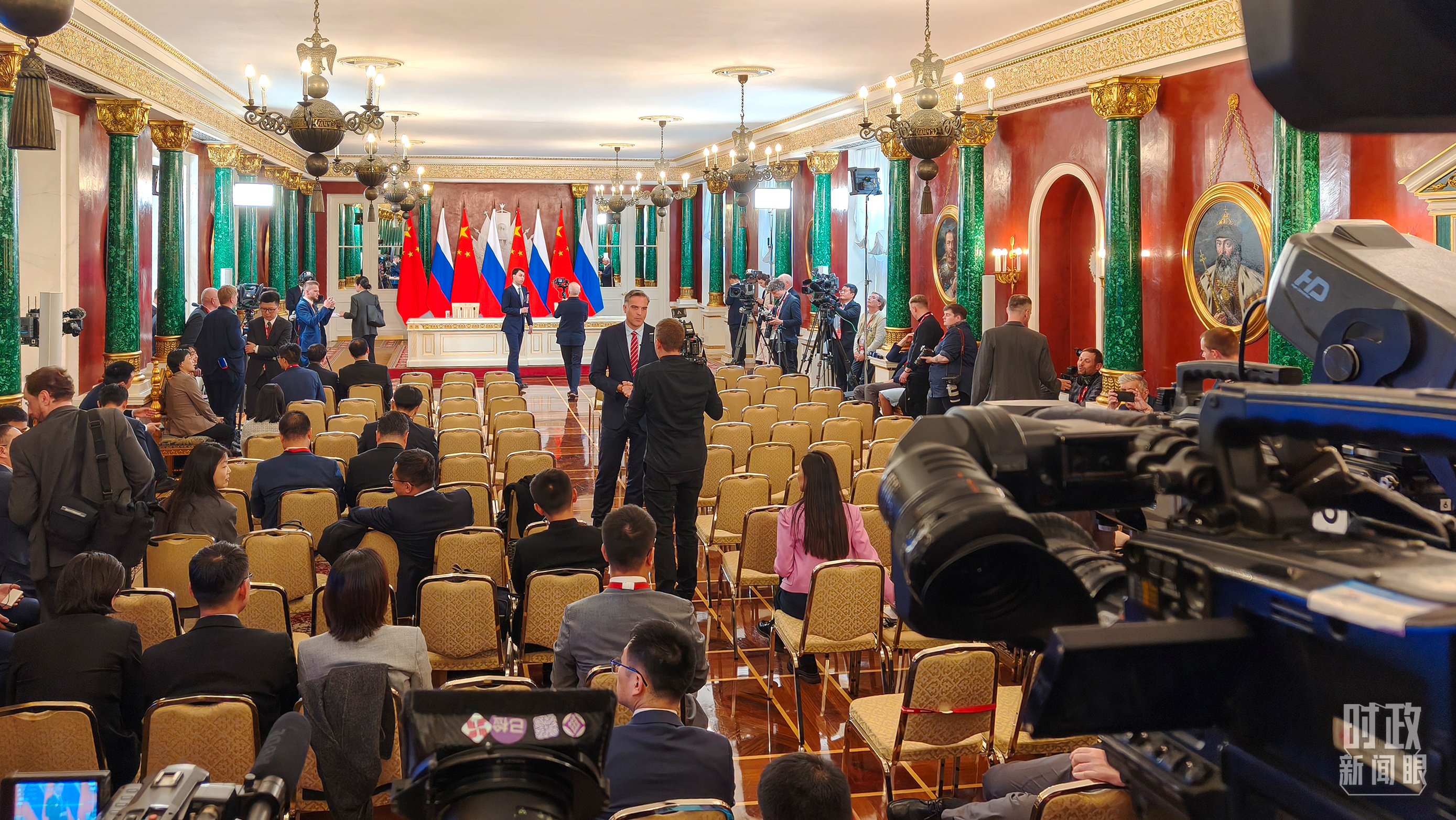 等待中俄兩國元首共見記者的中外媒體同仁。(總臺(tái)央視記者陸泓宇、蔣碩拍攝)