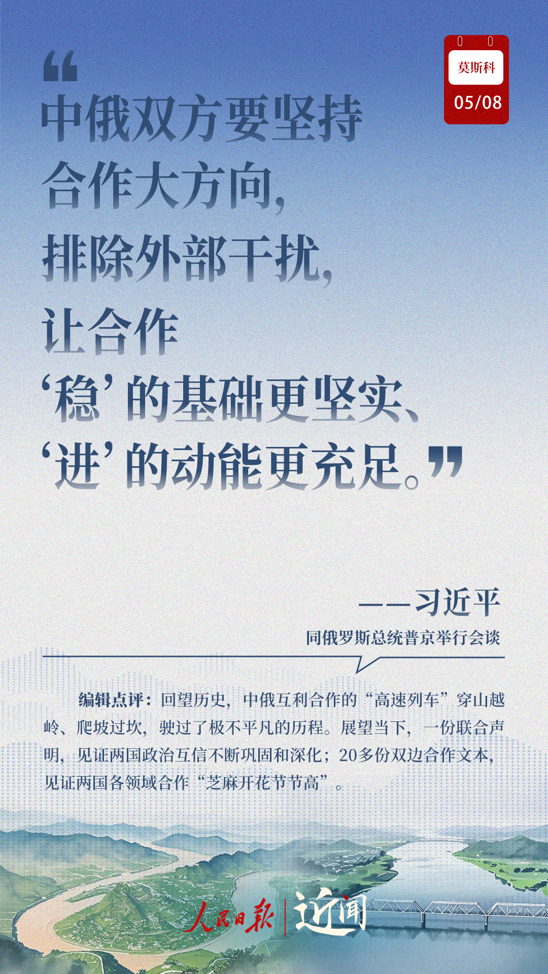 當(dāng)?shù)貢r(shí)間5月8日,習(xí)近平主席出席普京總統(tǒng)舉行的歡迎儀式、小范圍會(huì)談、大范圍會(huì)談、簽字和合作文本交換儀式、共見記者、茶敘,兩國(guó)元首不同形式的長(zhǎng)時(shí)間交流,引領(lǐng)中俄關(guān)系登高望遠(yuǎn)。
