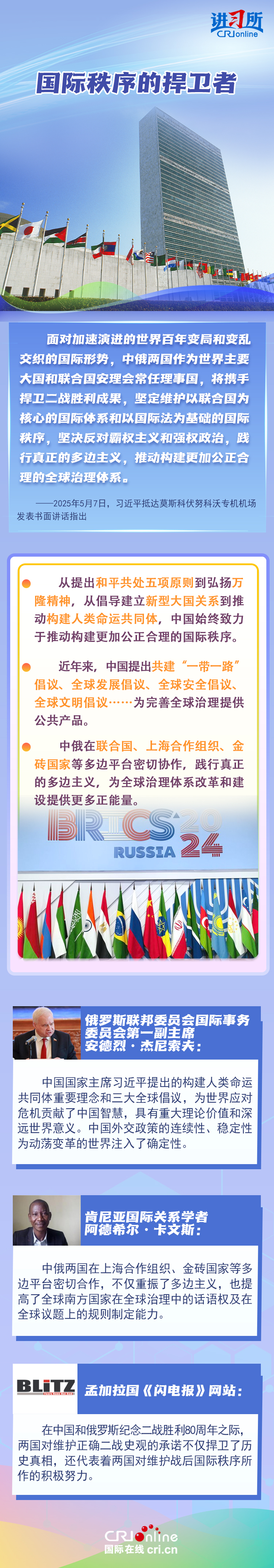 “兩國人民用鮮血和生命凝結(jié)的深厚情誼,如黃河之水奔騰不息,似伏爾加河寬廣深沉,成為中俄世代友好的不竭源泉?!苯衲晔侵袊嗣窨谷諔?zhàn)爭、蘇聯(lián)偉大衛(wèi)國戰(zhàn)爭暨世界反法西斯戰(zhàn)爭勝利80周年,也是聯(lián)合國成立80周年。在這一重要?dú)v史時間節(jié)點(diǎn),習(xí)近平主席此訪不僅為中俄關(guān)系發(fā)展注入強(qiáng)勁動力,也向世界宣示中俄兩國攜手捍衛(wèi)二戰(zhàn)勝利成果的堅定意志。