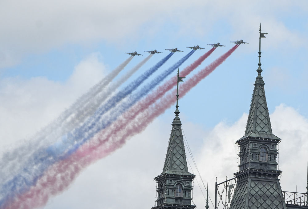 5月9日,在俄羅斯首都莫斯科,參加紀(jì)念蘇聯(lián)偉大衛(wèi)國戰(zhàn)爭勝利80周年閱兵式的戰(zhàn)機編隊拉煙飛行。新華社記者 賴向東 攝