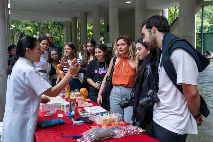 2025年4月15日,在巴西里約熱內(nèi)盧天主教大學(xué)舉辦的“國際中文日”慶?;顒?dòng)上,學(xué)生們觀看中醫(yī)療法展示。
