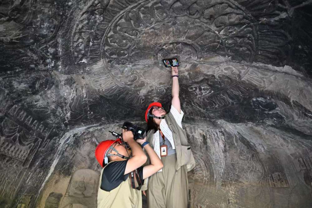 4月10日,龍門石窟研究院工作人員(右)與武漢大學文化遺產智能計算實驗室團隊成員一同對龍門石窟魏字洞進行高清攝影掃描。新華社記者 李嘉南 攝