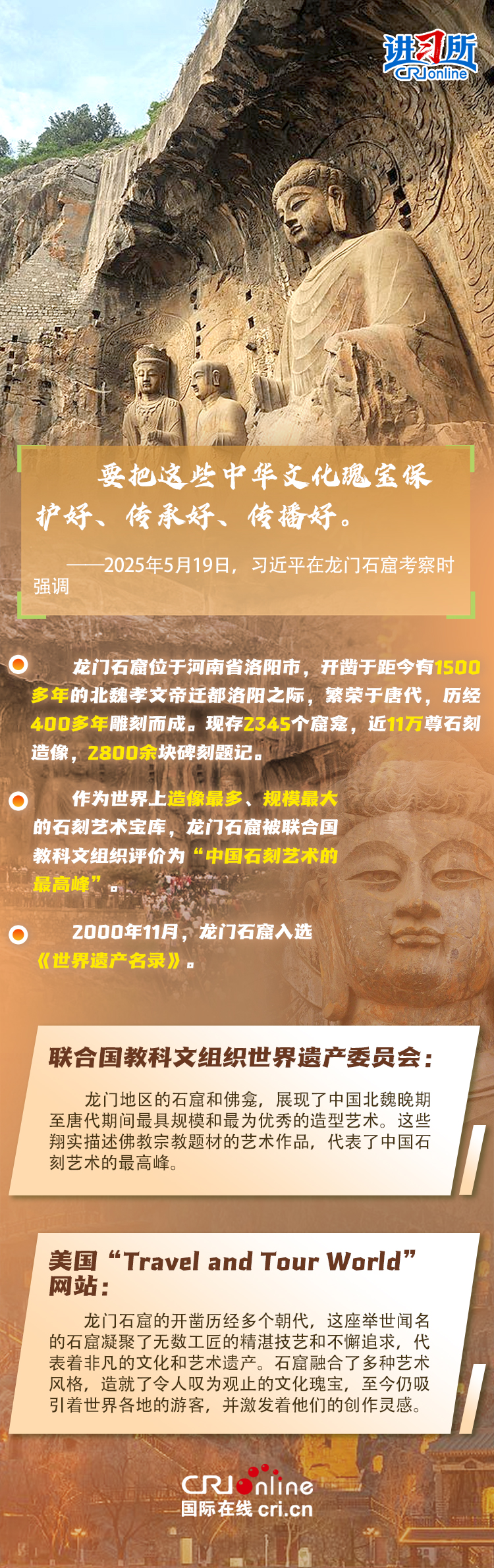 近日,中共中央總書記、國家主席習(xí)近平在河南洛陽考察調(diào)研。在龍門石窟,他察看石窟整體布局風(fēng)貌和代表性窟龕、造像,叮囑現(xiàn)場的文物保護(hù)工作者要把這些中華文化瑰寶保護(hù)好、傳承好、傳播好。