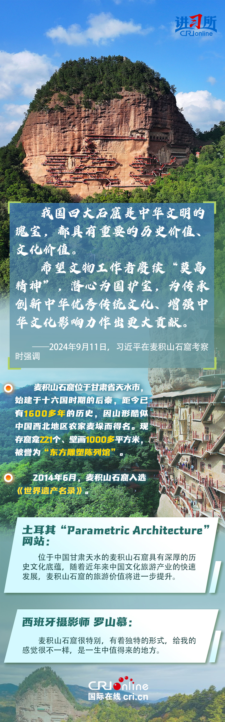 龍門石窟被聯(lián)合國教科文組織評價(jià)為“中國石刻藝術(shù)的最高峰”,與敦煌莫高窟、云岡石窟、麥積山石窟并稱為“中國四大石窟”,具有重要?dú)v史價(jià)值、文化價(jià)值。近年來,習(xí)近平先后考察了中國四大石窟。對這些承載著中華民族文化基因和血脈的文物和文化遺產(chǎn),習(xí)近平強(qiáng)調(diào),“保護(hù)好、傳承好歷史文化遺產(chǎn)是對歷史負(fù)責(zé)、對人民負(fù)責(zé)?!?/p>
