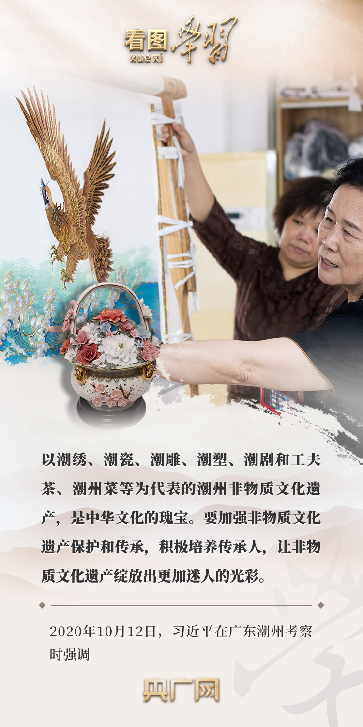 從古典民族史詩《格薩(斯)爾》到潮繡、潮瓷、潮劇和工夫茶,再到漢中藤編、常德絲弦……在各地考察調(diào)研時,習(xí)近平總書記曾多次就文化傳承發(fā)展、非物質(zhì)文化遺產(chǎn)保護(hù)作出重要指示,強(qiáng)調(diào)要“讓非物質(zhì)文化遺產(chǎn)綻放出更加迷人的光彩”。