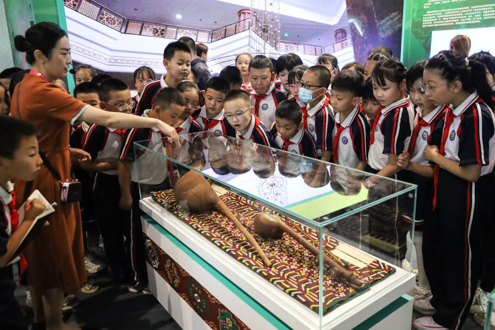 2023年9月7日,在甘肅敦煌舉行的第六屆絲綢之路(敦煌)國際文化博覽會(huì)上,學(xué)生們參觀土庫曼斯坦專題展。