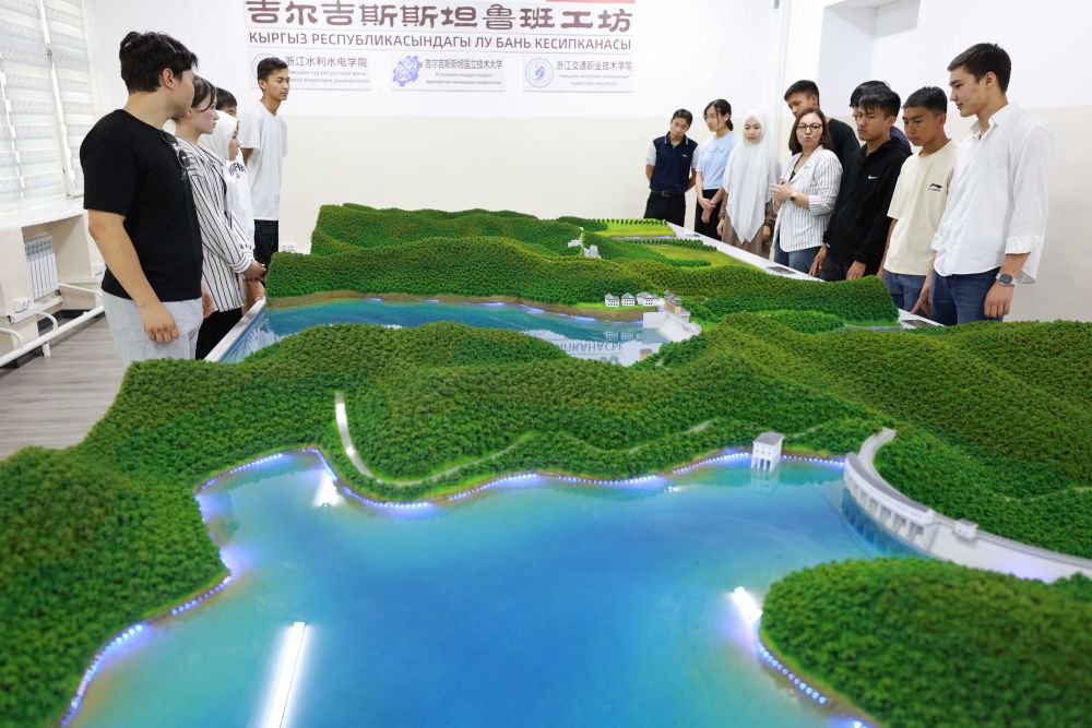 2025年6月4日,學(xué)生在吉爾吉斯斯坦首都比什凱克的魯班工坊水利樞紐工程模擬演示實(shí)驗(yàn)室學(xué)習(xí)水電站知識(shí)。這家魯班工坊由浙江水利水電學(xué)院與吉爾吉斯斯坦國立技術(shù)大學(xué)等聯(lián)合建設(shè),投入運(yùn)行半年多來,已有4000多名學(xué)生在這里接受技術(shù)培訓(xùn)。