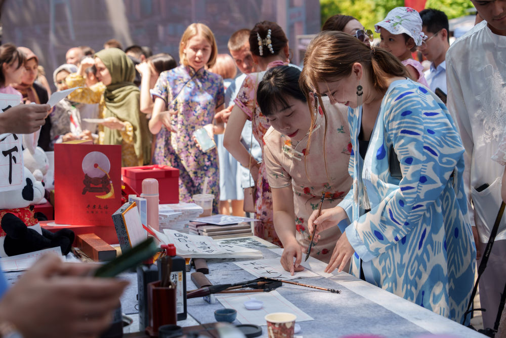 2025年4月19日,在哈薩克斯坦阿拉木圖,一名中國文化愛好者在“國際中文日”慶?;顒?dòng)上體驗(yàn)書法。