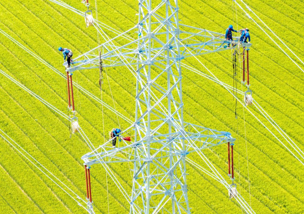 2025年5月4日,電力施工人員在江蘇省揚(yáng)州市江都區(qū)武堅(jiān)鎮(zhèn)至江蘇省興化經(jīng)濟(jì)開發(fā)區(qū)的220千伏華電武堅(jiān)25萬(wàn)千瓦集中式光伏項(xiàng)目配套輸電線路上作業(yè)(無(wú)人機(jī)照片)。新華社發(fā)(任飛攝)