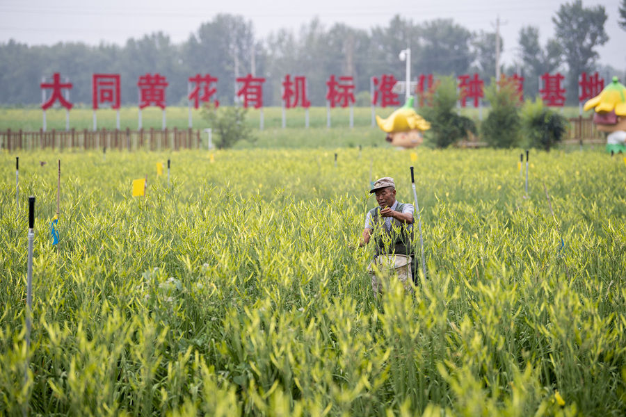 村民在位于云州區(qū)唐家堡村的大同黃花有機標準化種植基地內(nèi)采摘黃花(2022年7月27日攝)。新華社記者 楊晨光 攝
