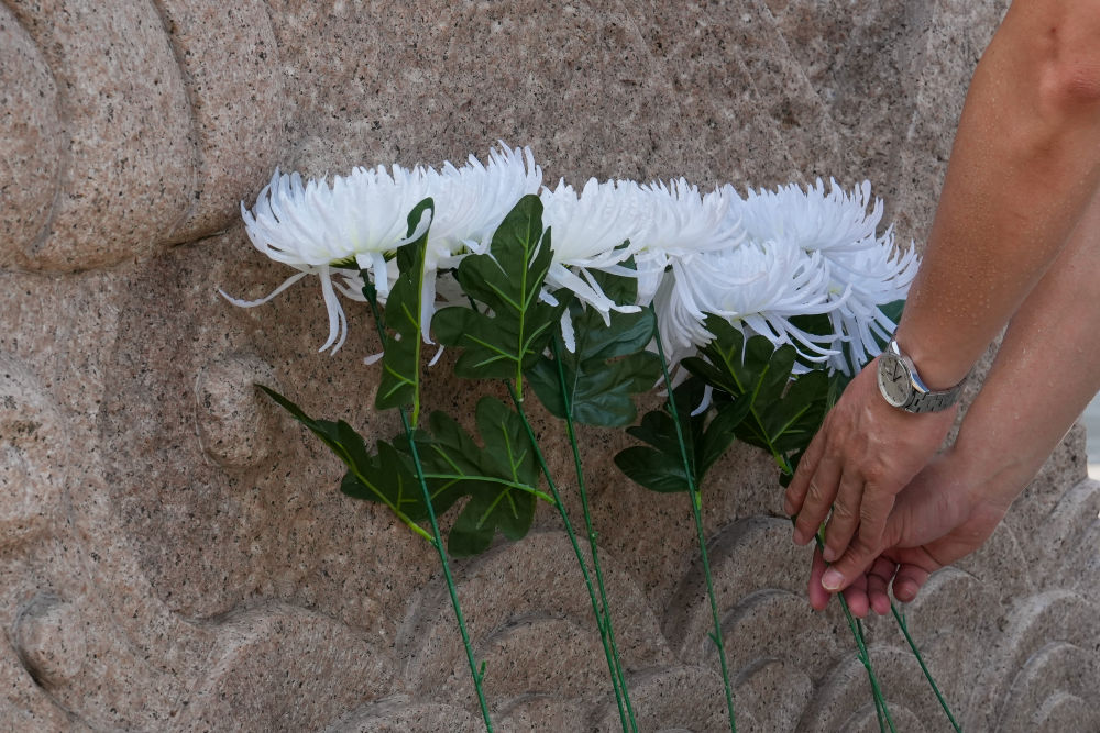 2025年7月7日,觀眾在南京抗日航空烈士紀念館紀念碑前獻花,緬懷英烈。新華社記者 李博 攝