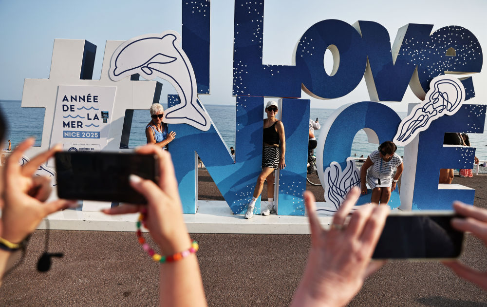 6月10日,在法國尼斯的盎格魯街上,人們在國際海洋年和第三屆聯(lián)合國海洋大會主題的景觀前拍照。新華社記者 高靜 攝