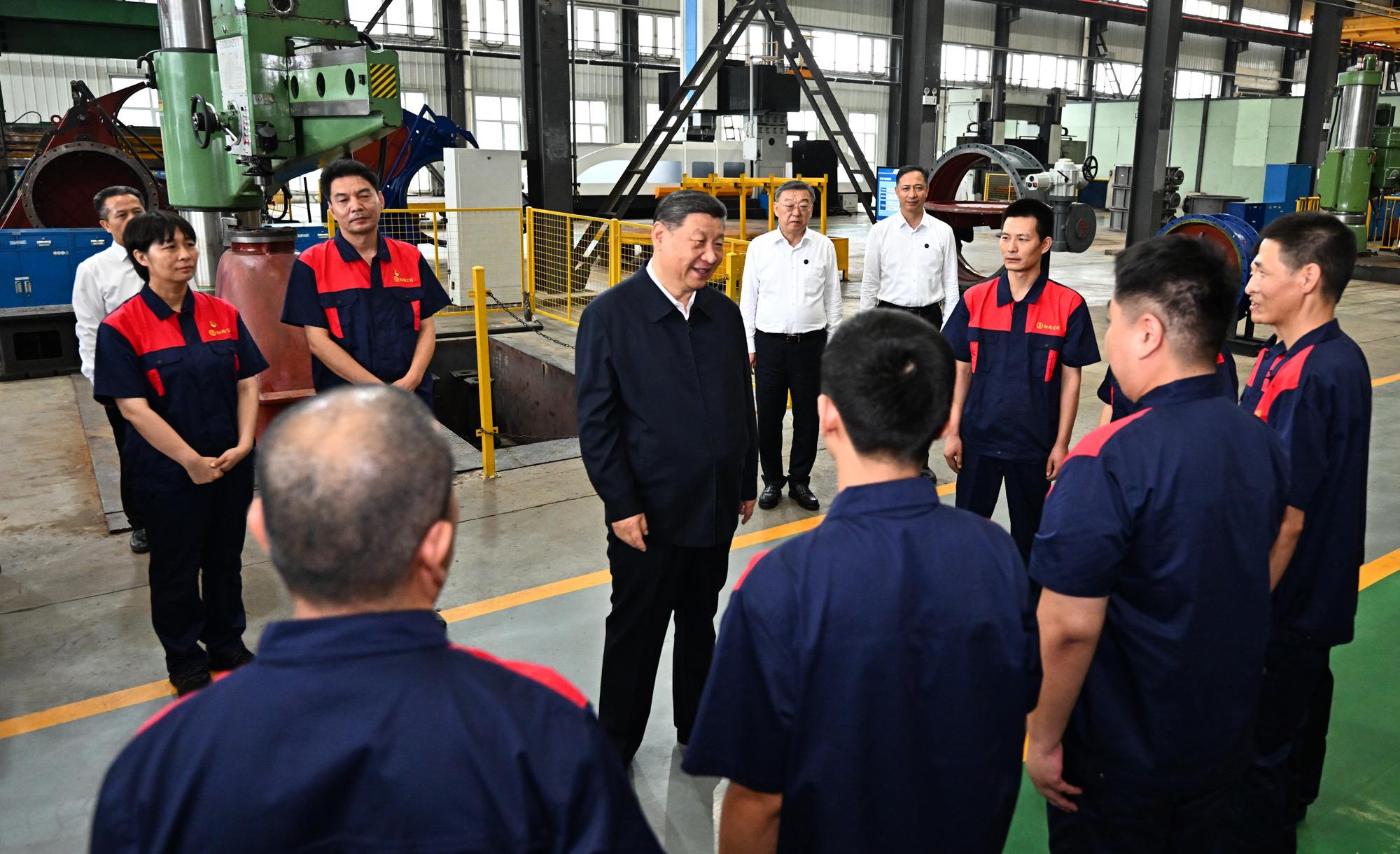 2025年7月7日,習近平總書記在山西陽泉閥門股份有限公司考察時,同企業(yè)員工親切交流。