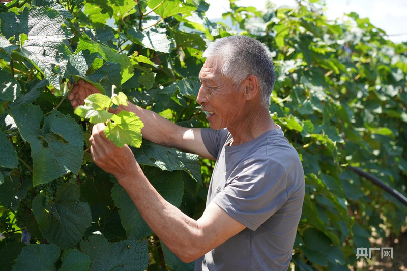 盛夏時(shí)節(jié),內(nèi)蒙古赤峰市喀喇沁旗馬鞍山村綠意盎然,一串串山葡萄綴滿枝頭,村民張國(guó)利和妻子趙國(guó)俠正忙著田間管護(hù)?!跋襁@棵秧能結(jié)10斤左右山葡萄,一畝地能收約3000斤、賣6000元左右?!睆垏?guó)利說。