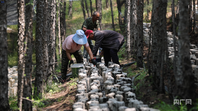 村民在馬鞍山林場(chǎng)林下經(jīng)濟(jì)試驗(yàn)示范基地采摘木耳(央廣網(wǎng)發(fā) 劉德胤 攝)