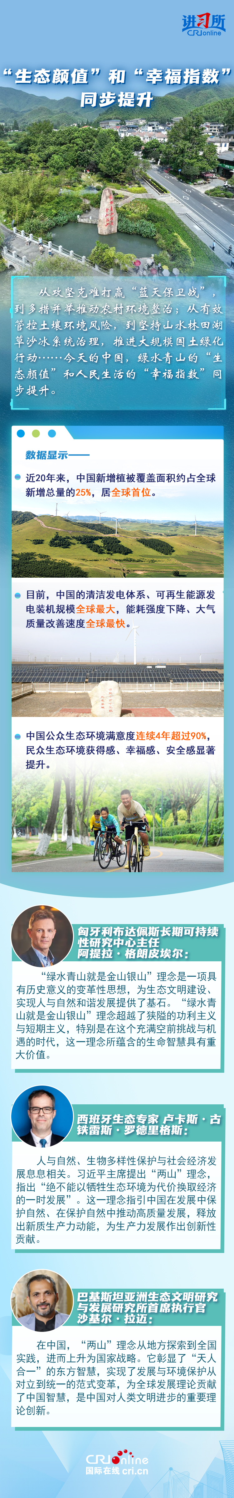 “從歷史長(zhǎng)河來看,如果說我們這一代人能留給后人點(diǎn)什么,我看生態(tài)文明建設(shè)就是很重要的一個(gè)方面。生態(tài)文明建設(shè)最能給老百姓帶來獲得感,環(huán)境改善了,老百姓體會(huì)也最深?!?0年前,時(shí)任中共浙江省委書記的習(xí)近平在安吉余村考察時(shí),肯定了余村下定決心關(guān)閉礦區(qū)、全面走綠色發(fā)展之路的做法,并首次提出“綠水青山就是金山銀山”重要理念,20年來,這一重要理念帶給中國(guó)大地一場(chǎng)革命性變化,直接推動(dòng)美麗中國(guó)建設(shè)取得歷史性成就。