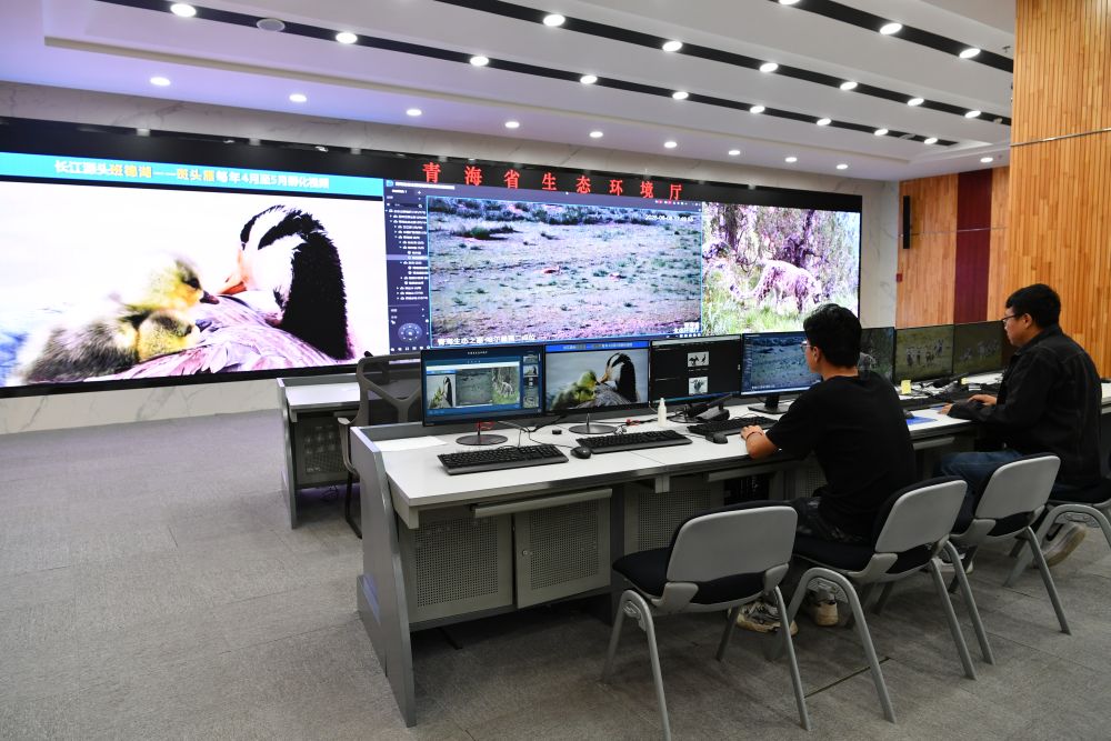 8月8日,青海省生態(tài)環(huán)境廳信息中心工作人員正在分析野生動物監(jiān)測畫面。(劉紅 攝)