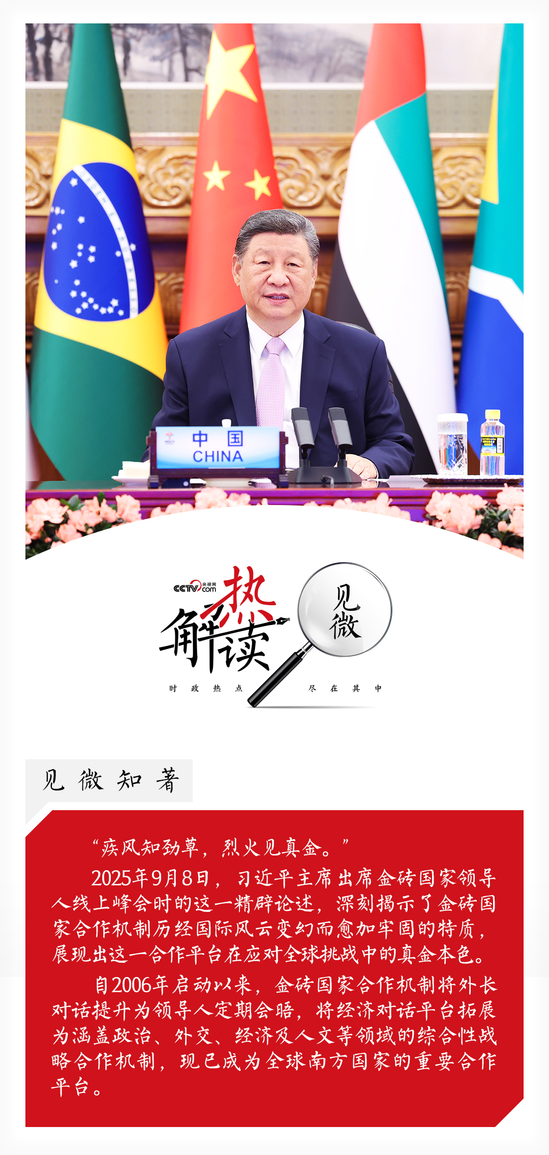 熱解讀9月8日晚,習(xí)近平主席在北京以視頻方式出席金磚國(guó)家領(lǐng)導(dǎo)人線上峰會(huì)并發(fā)表重要講話。