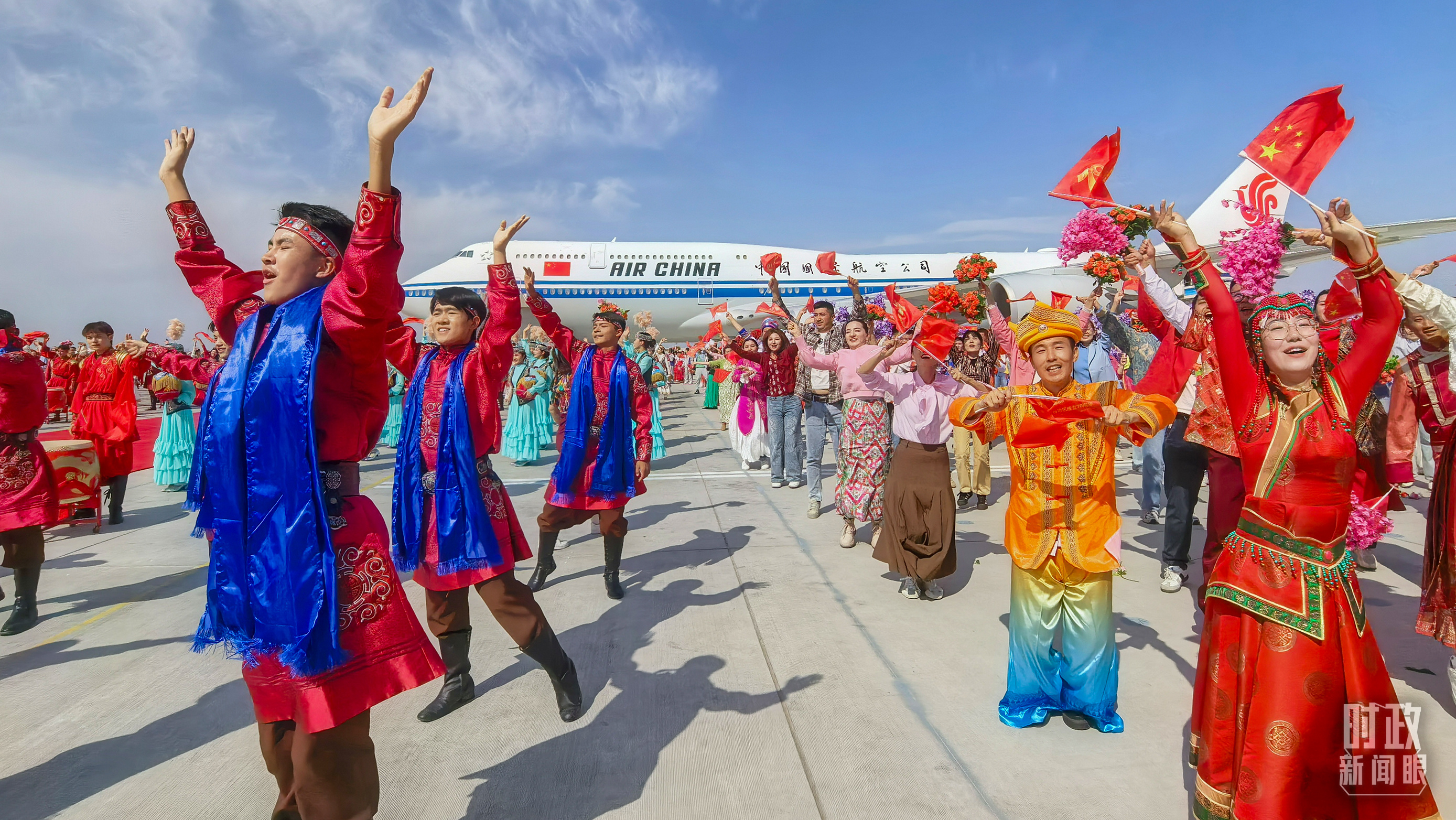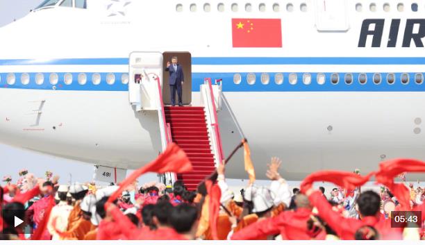 在機(jī)場,各族群眾代表身著民族服飾,載歌載舞。從機(jī)場到住地,各族群眾手持紅旗,熱情歡呼,表達(dá)對總書記的歡迎和感激之情。