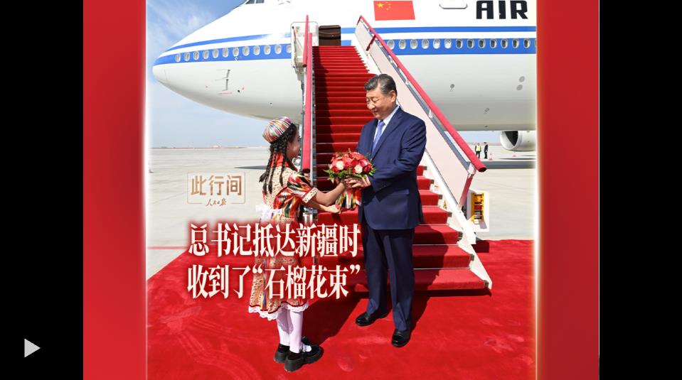 習近平率中央代表團23日下午乘專機抵達烏魯木齊,出席新疆維吾爾自治區(qū)成立70周年慶祝活動,新疆各族群眾在機場熱烈歡迎??倳浭盏降幕ㄊ铮b點了美麗的石榴。如今,“石榴籽”的妙喻為人熟知,民族團結觀念深入人心。