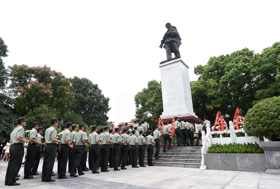在位于重慶市銅梁區(qū)的邱少云烈士紀(jì)念館,武警官兵向邱少云烈士紀(jì)念碑獻(xiàn)花(2017年9月30日攝)。新華社記者 唐奕 攝