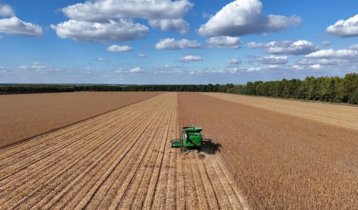2025年9月19日,在北大荒集團黑龍江格球山農場有限公司大豆地塊,收獲機車在進行收獲作業(yè)(無人機照片)。新華社發(fā)(陸文祥攝)