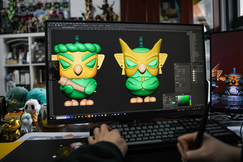 2025年3月1日,文創(chuàng)產(chǎn)品策劃運(yùn)營(yíng)師曾舟在位于四川成都的辦公室內(nèi)完善文創(chuàng)產(chǎn)品細(xì)節(jié)。他以三星堆青銅神樹(shù)、青銅縱目面具、青銅獸面等文物為創(chuàng)作藍(lán)本,結(jié)合潮玩元素設(shè)計(jì)的文創(chuàng)作品廣受歡迎?!拔蚁胱龅牟皇峭婢呖煜?,而是有內(nèi)容、有溫度、有意義的文化IP,讓年輕一代隨手摸到沉淀千年的文化?!痹壅f(shuō)。