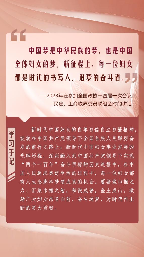 黨的十八大以來,習(xí)近平總書記關(guān)心關(guān)懷婦女全面發(fā)展、謀劃部署推進(jìn)婦女工作,激勵(lì)億萬婦女在實(shí)現(xiàn)中華民族偉大復(fù)興的新征程上昂首向前、奮斗逐夢(mèng),也為加快實(shí)現(xiàn)性別平等、促進(jìn)全球婦女事業(yè)發(fā)展指引方向。