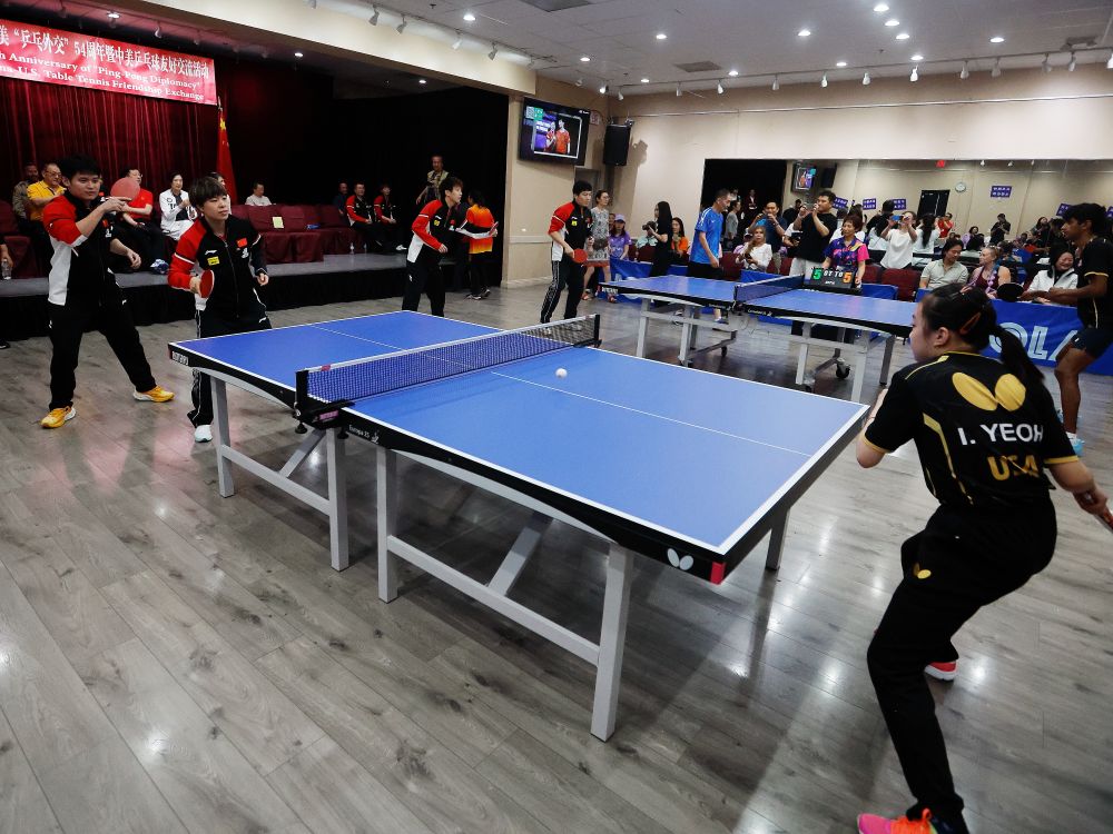 這是7月13日在美國內(nèi)華達州拉斯維加斯拍攝的紀念中美“乒乓外交”54周年暨中美乒乓球友好交流活動現(xiàn)場。新華社發(fā)(邱晨攝)